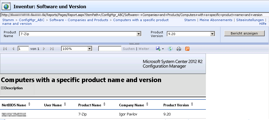 In diesem Beispiel wurde ein SCCM-Bericht eingebunden.