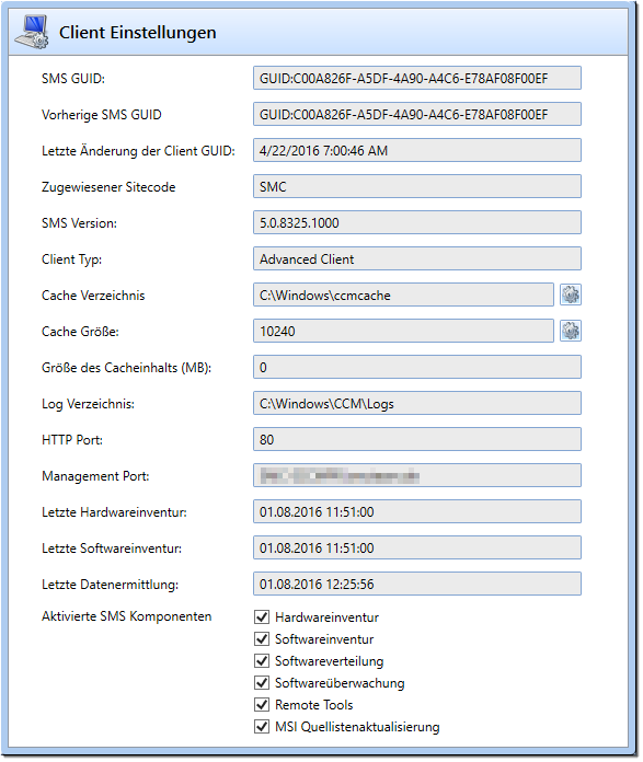 Das „Client Settings“-Plugin zeigt die aktuellen SCCM‑Clienteinstellungen eines ausgewählten Geräts an. Zusätzlich können darüber die Cachegröße sowie das Cacheverzeichnis des Clients angepasst werden.